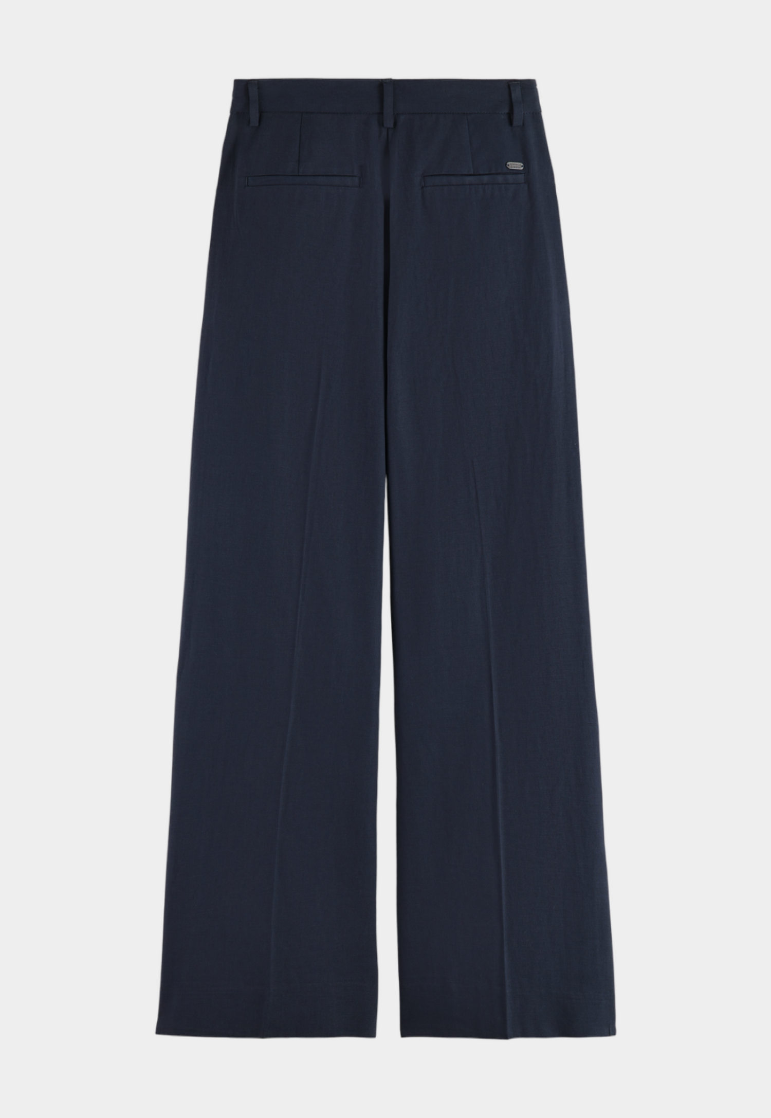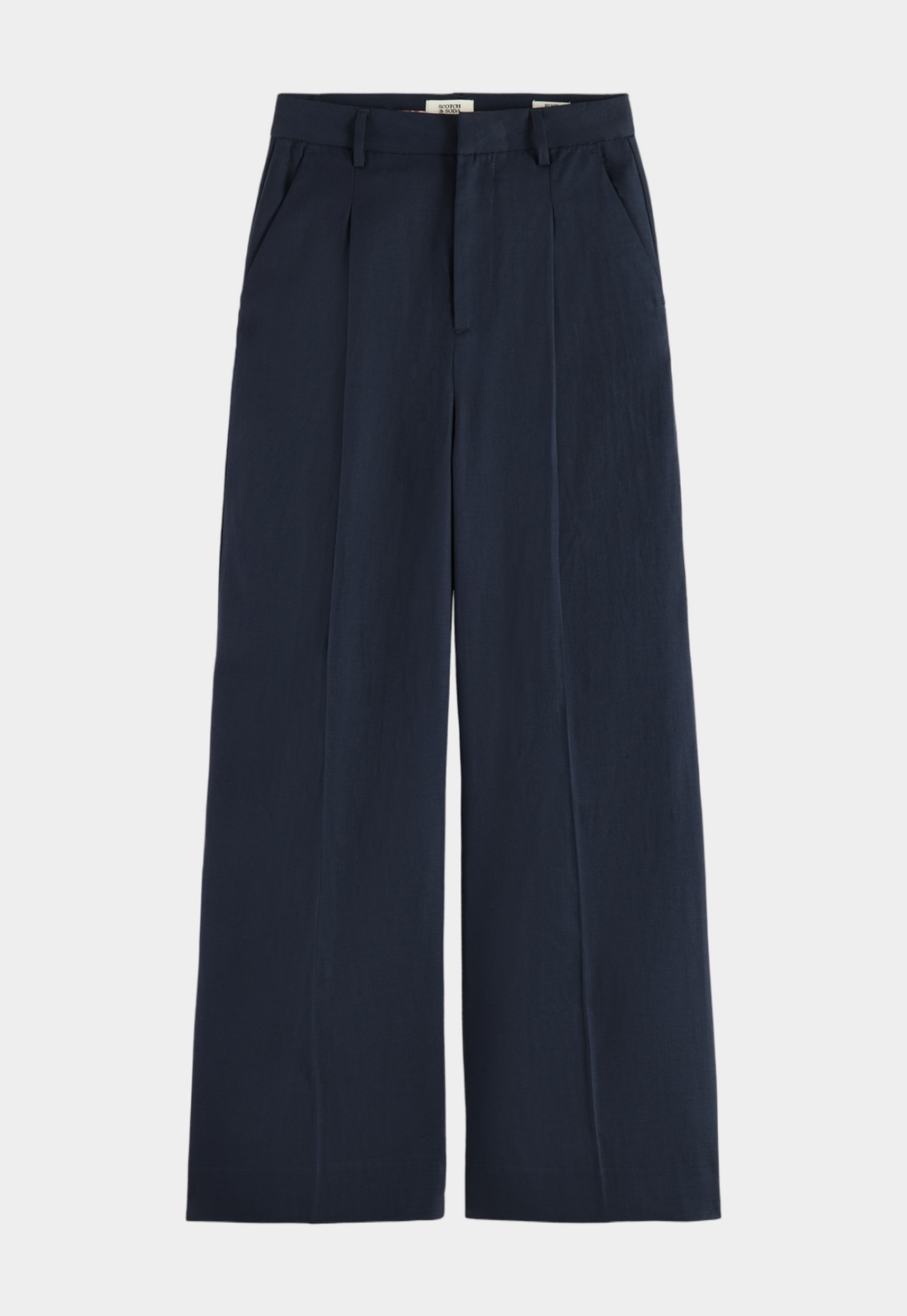 מכנסיים ארוכים לנשים מבית המותג סקוצ' אנד סודה. בגזרה גבוהה ורחבה, עם לולאות לחגורה, שני כיסים קדמיים ושני דמויי כיסים אחוריים.