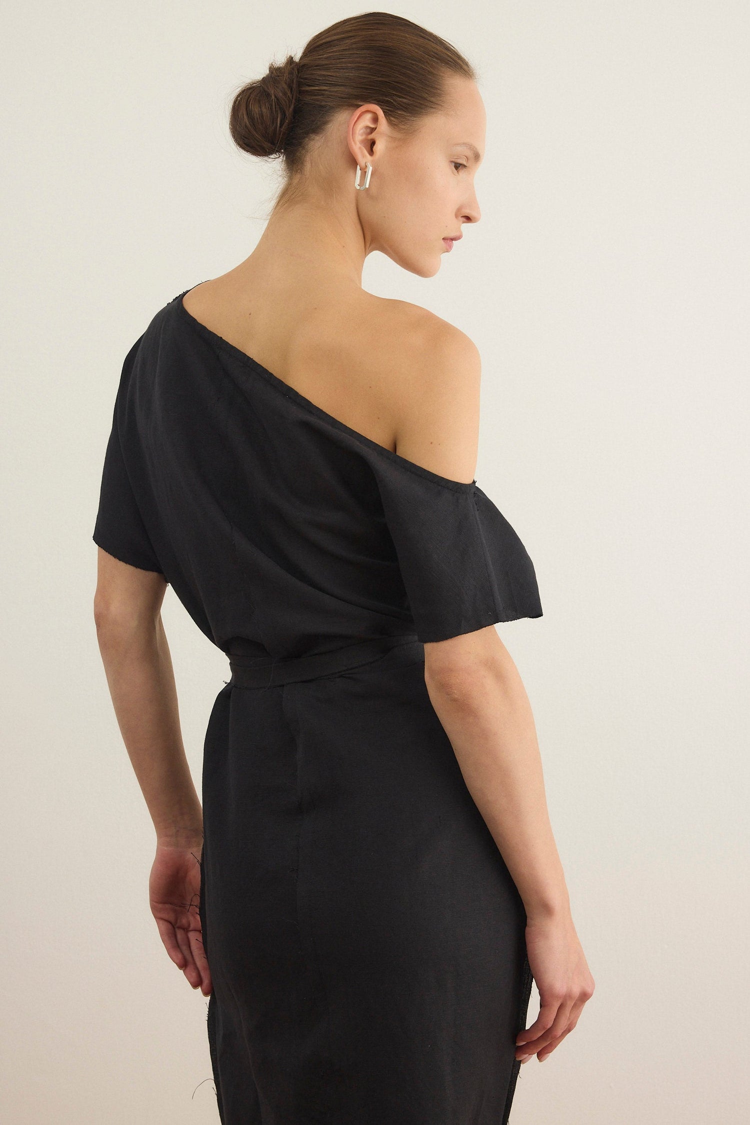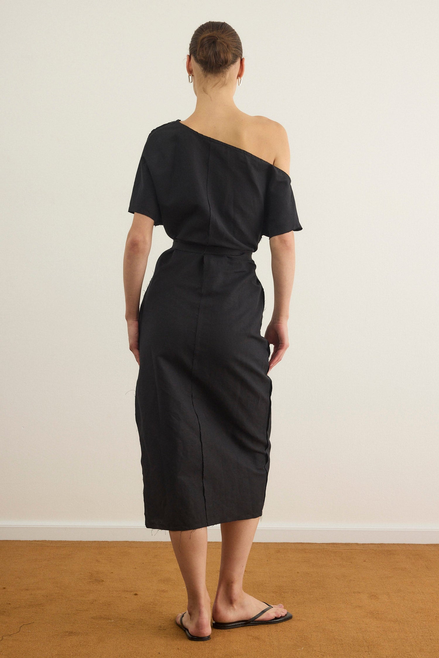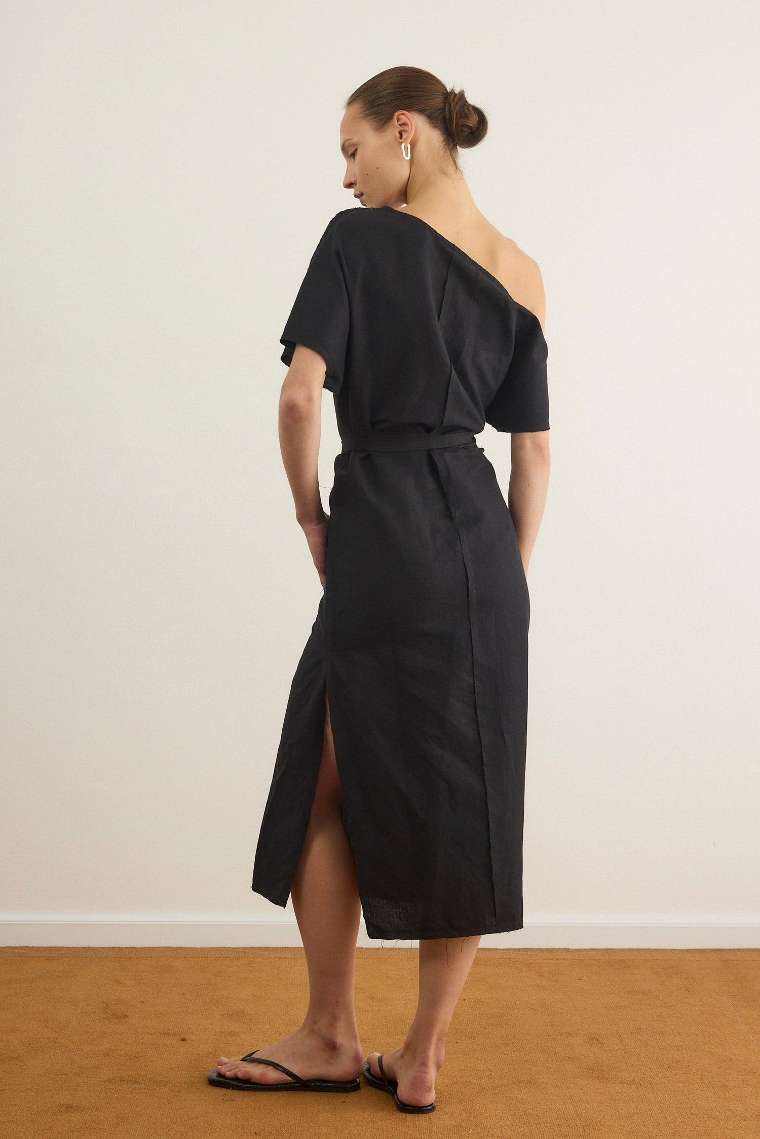 שמלת מידי אסימטרית בגזרה צמודה עם קשירה במותן ושסע בתפר צד ודיטיילס פרימות בסיומת, עשויה מבד פשתן נעים וקייצי.