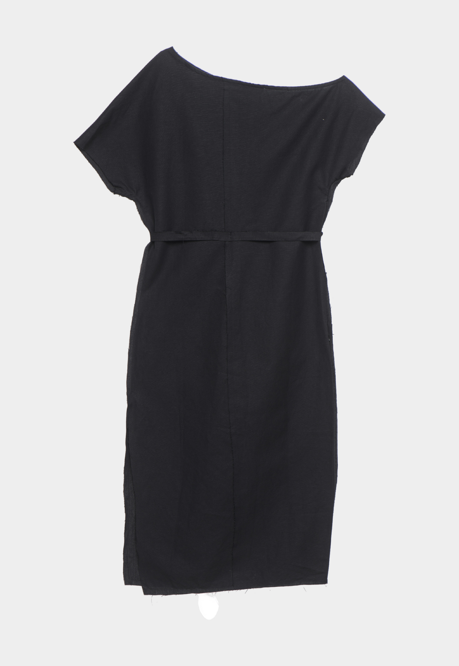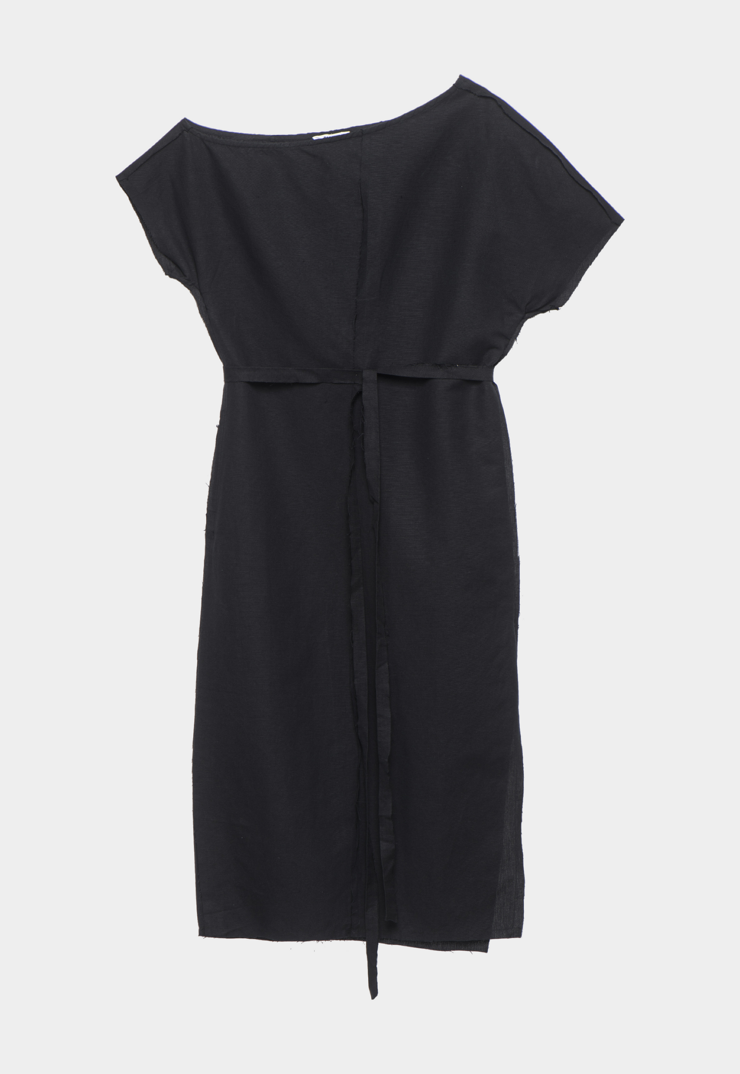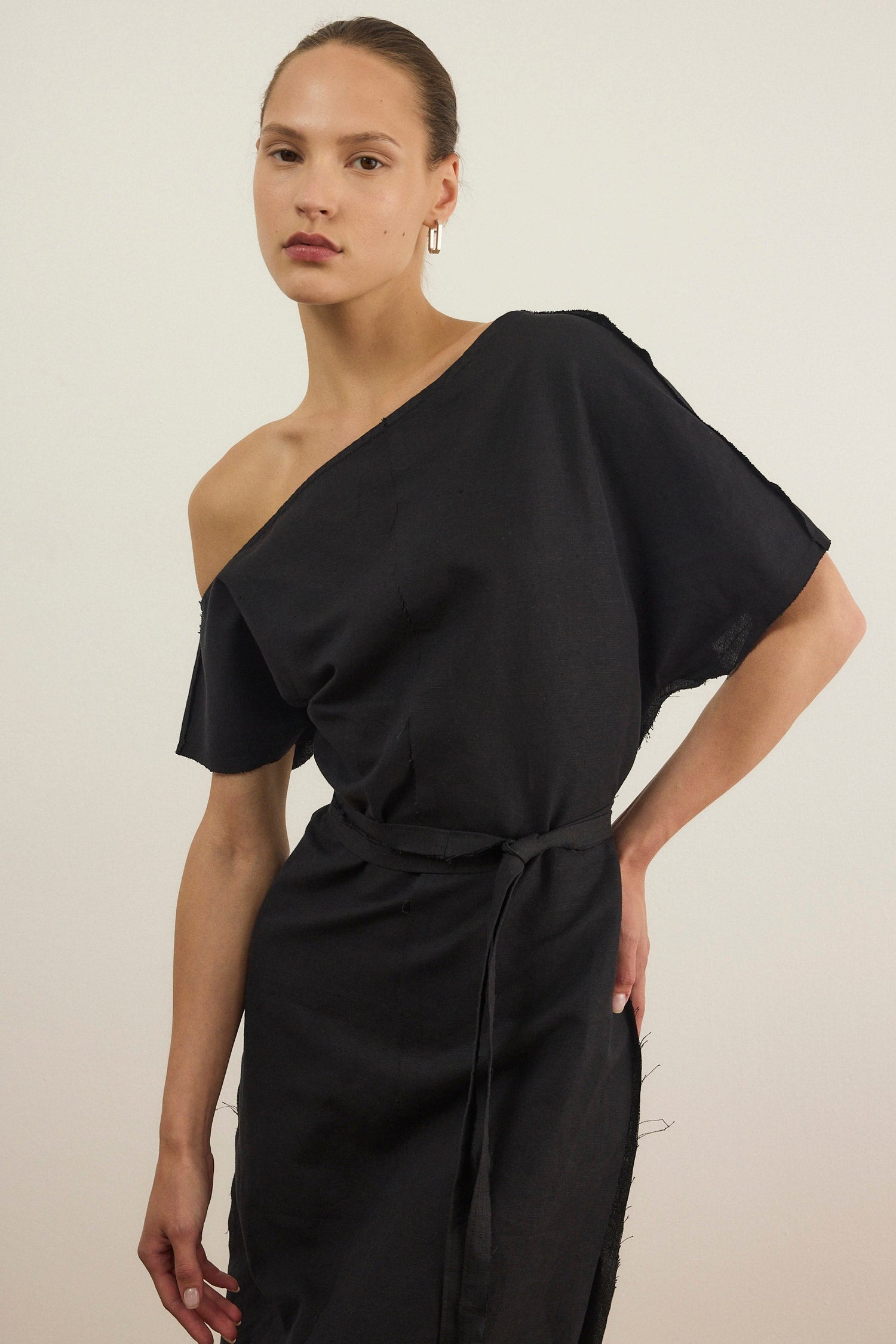 שמלת מידי אסימטרית בגזרה צמודה עם קשירה במותן ושסע בתפר צד ודיטיילס פרימות בסיומת, עשויה מבד פשתן נעים וקייצי.