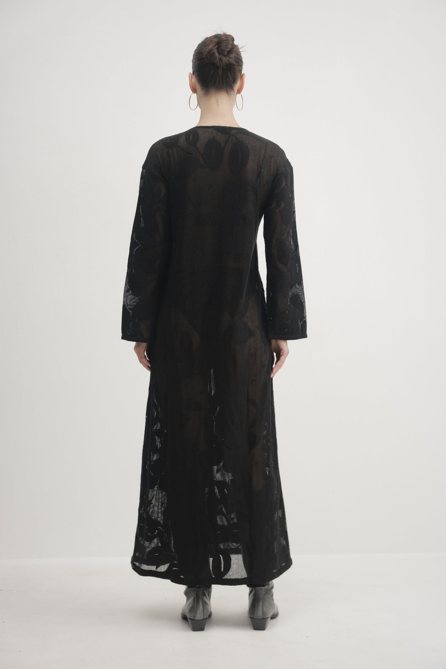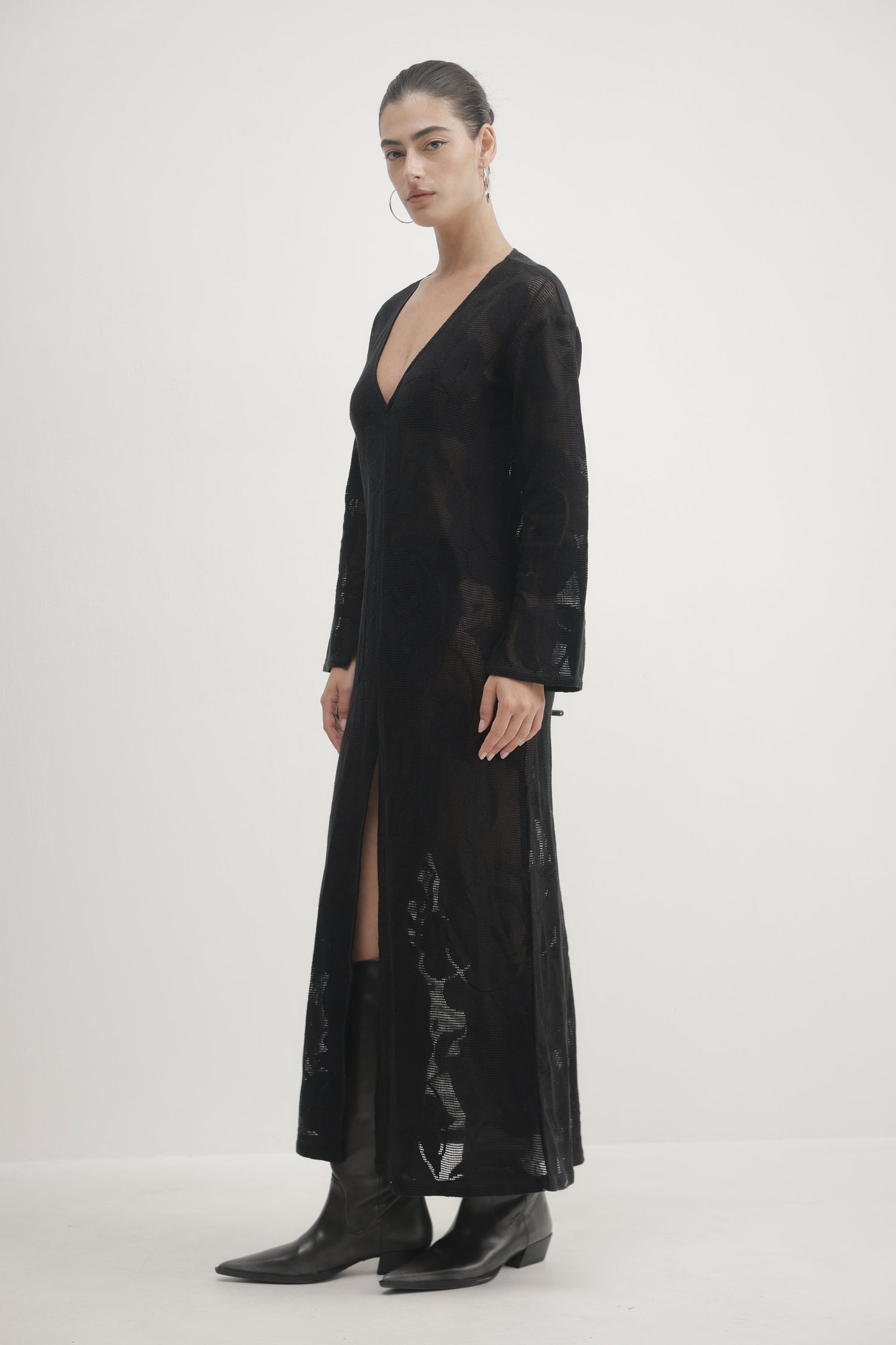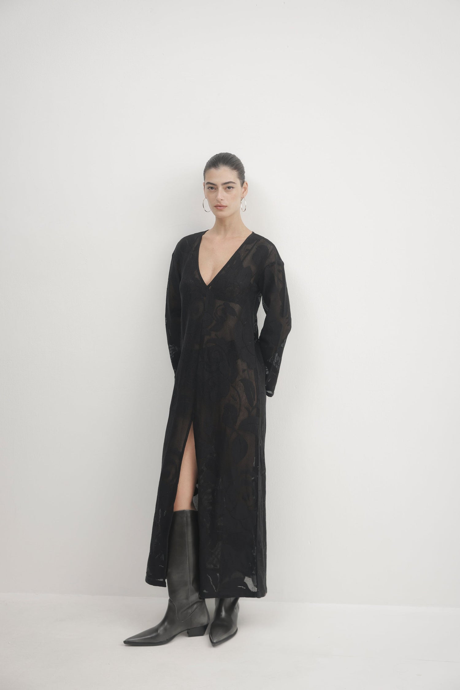 שמלת קרושה מבד 100% כותנה בדוגמאת פרחים, עם שרוולים ארוכים ומחשוף עמוק, מתאימה לאאוטפיט חופשה מעל בגד ים או עם חלק תחתון מנימליסטי כמו בגד גוף או תחתית ליום יום.