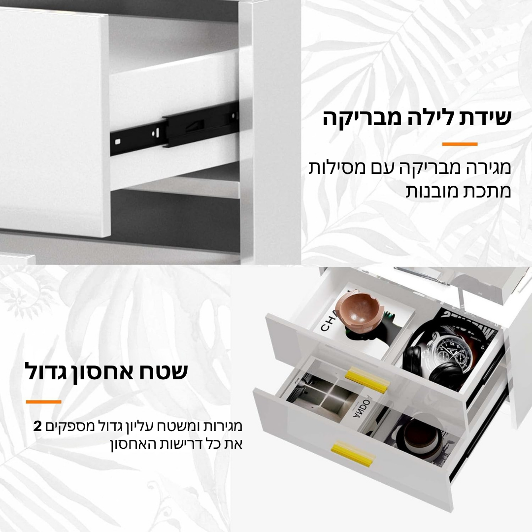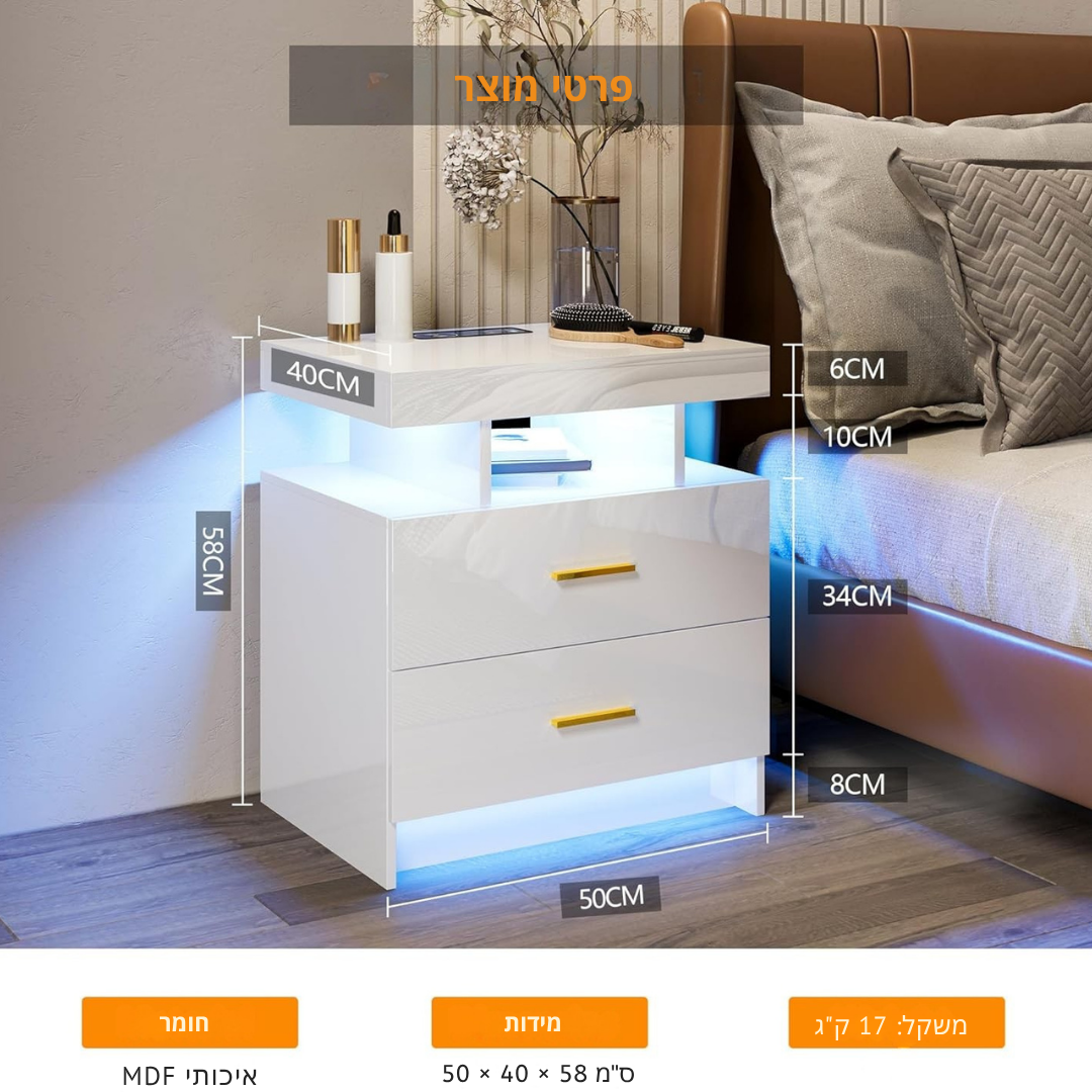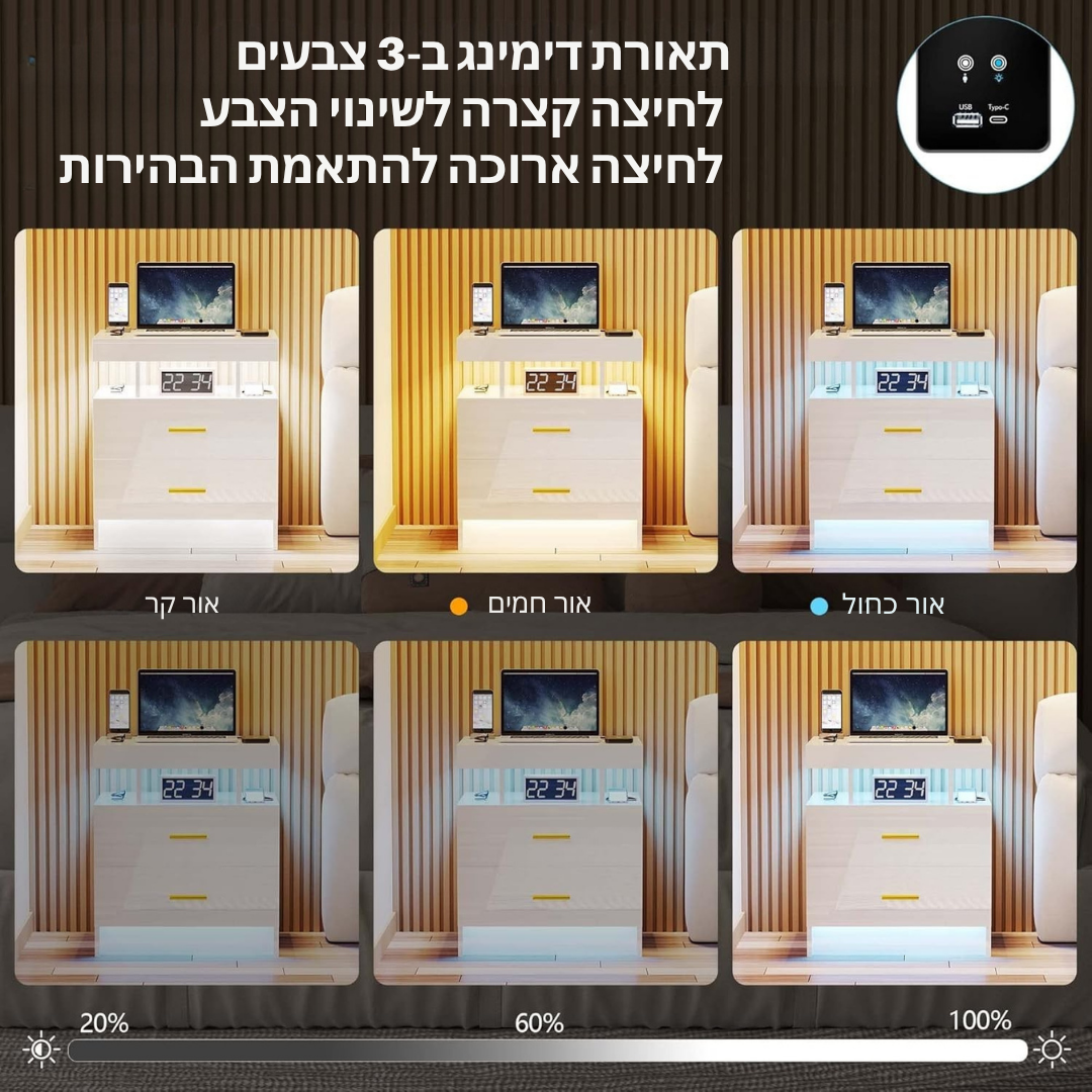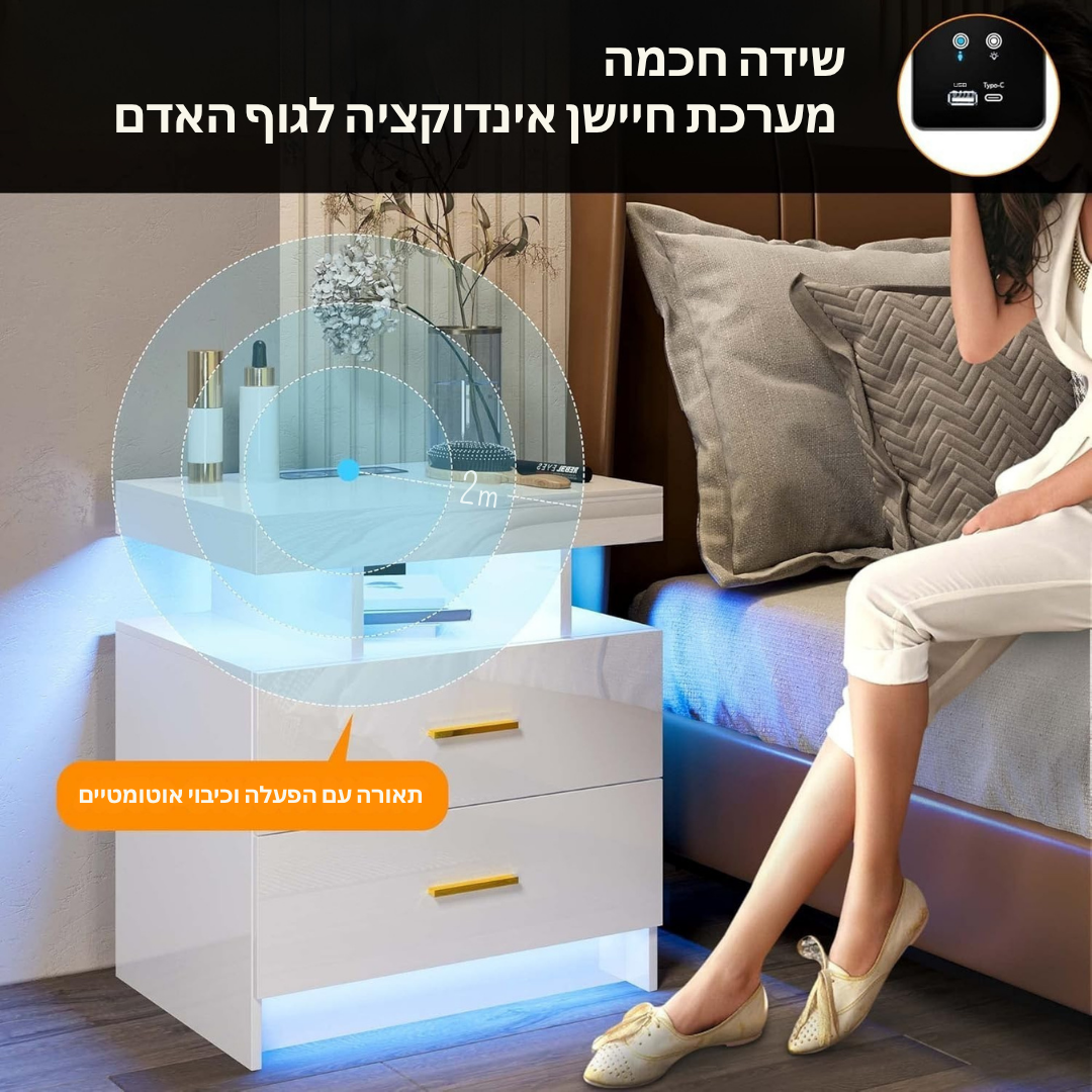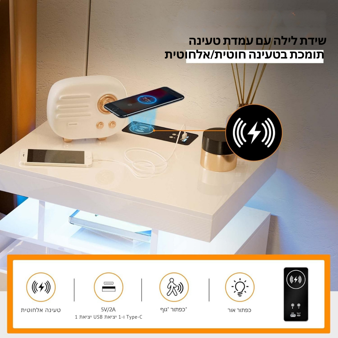 ™Eramor | שידת לילה חכמה עם תאורת LED ויציאות USB – עיצוב לבן מבריק